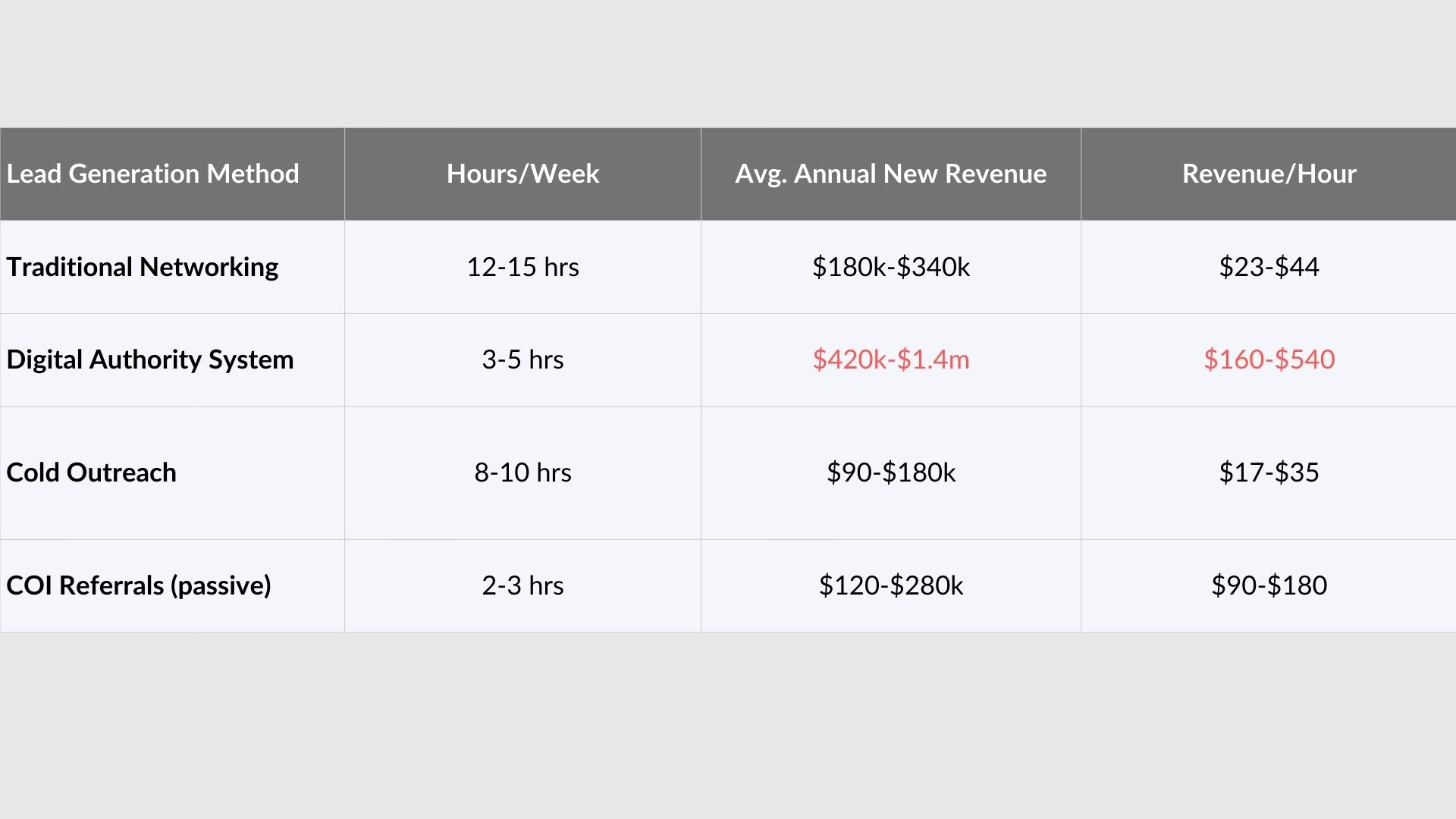 The first one, let’s call him the Traditional Joe, is exhausted. He’s logging 15 hours a week at networking events, charity board meetings, and those COI lunches where everyone pretends the rubber chicken is edible. His calendar looks like a hostage negotiation. Last year, after all that grip-and-grin hustle, he added over $300K in new revenue. Respectable, sure. But his hourly math? Frustrating.