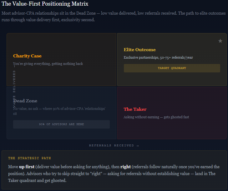 The core principle is deceptively simple: instead of asking “Can you refer clients to me?”, elite Private Wealth Managers ask, “How can I help you build your business and solve your biggest client challenges?” That one shift changes everything, the power dynamic, the CPA’s receptivity, and the referral math.