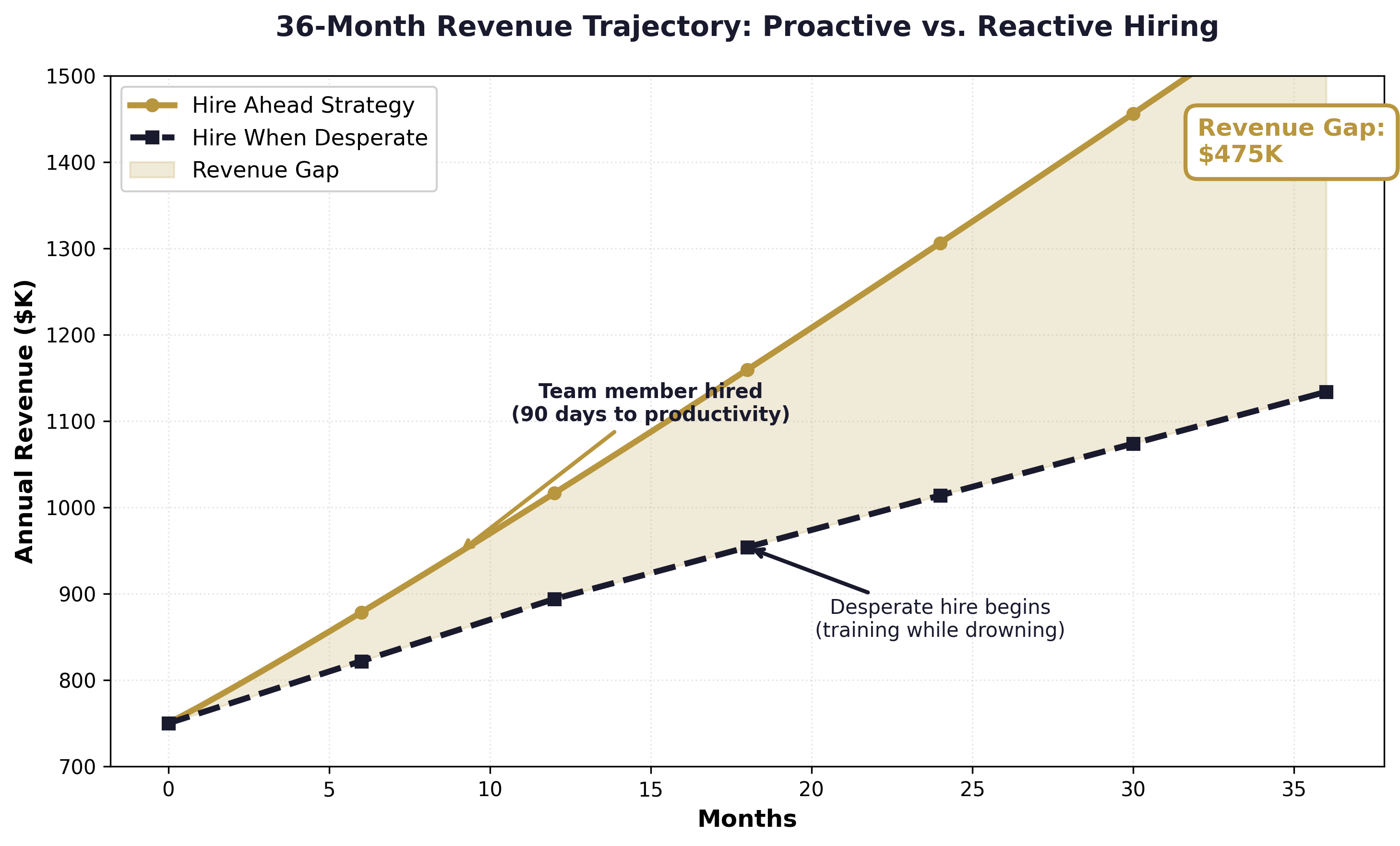 36-month revenue impact: Hire Ahead vs. Hire When Desperate