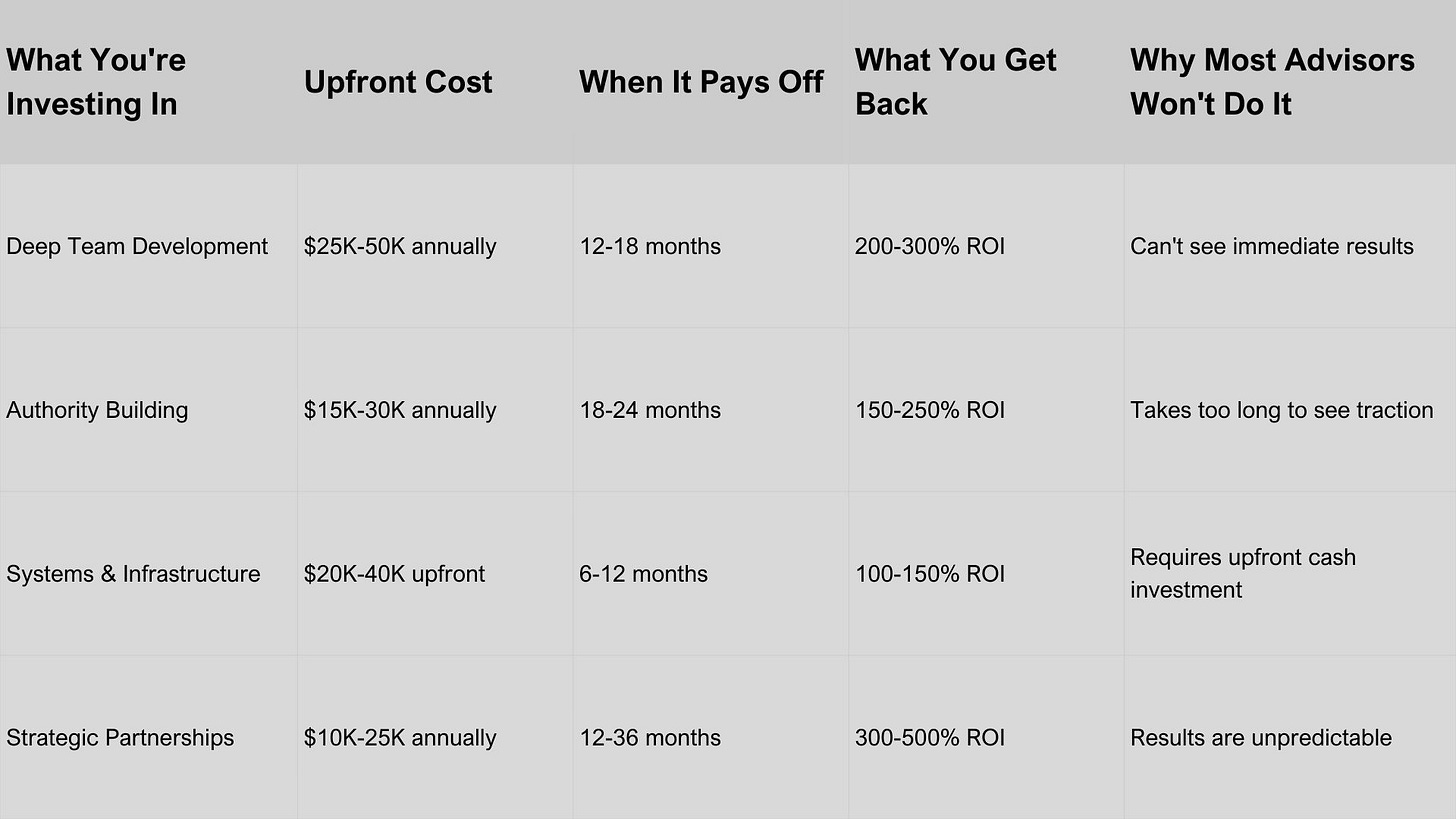 "The difference between advisors who plateau at $500K and those who scale beyond $2M isn't talent or market conditions—it's their willingness to invest in outcomes that won't materialize for 18-36 months."