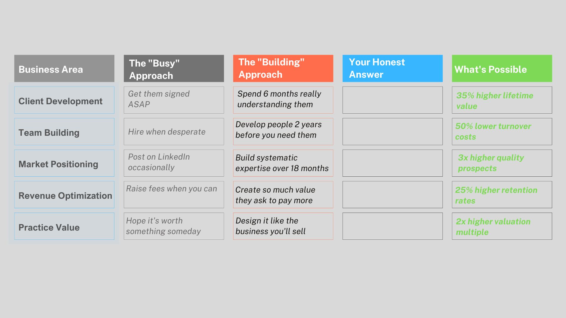If you just realized you're stuck in the "busy" column instead of the "building" column, you're not alone—and you're not stuck there. The Chairman's Council Toolkit shows you exactly how to shift from short-term thinking to long-term wealth creation. Get immediate access to our 3-Year Client Development Framework and start building relationships that compound into millions. [Access Premium Tools →]
