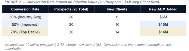 Moving your conversion rate from 35% to 60% on a 20-prospect pipeline at $1M average client size represents $5M in additional AUM from the exact same activity. The Close Rate Optimizer in the Advisor Tools section at Synseus.com will show you exactly what your current process is costing you. The math justifies immediate action.