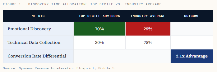According to the Synseus Revenue Acceleration Blueprint, Wealth Advisors who redesigned their discovery process around emotional motivations rather than data collection saw conversion rates climb from 35% to 72% within 90 days of implementation. The upstream effect was equally dramatic: average client size moved from $650,000 to $1.2 million, and new assets gathered annually jumped from $12 million to $42 million. Same advisors, same fees, same market. Different process.